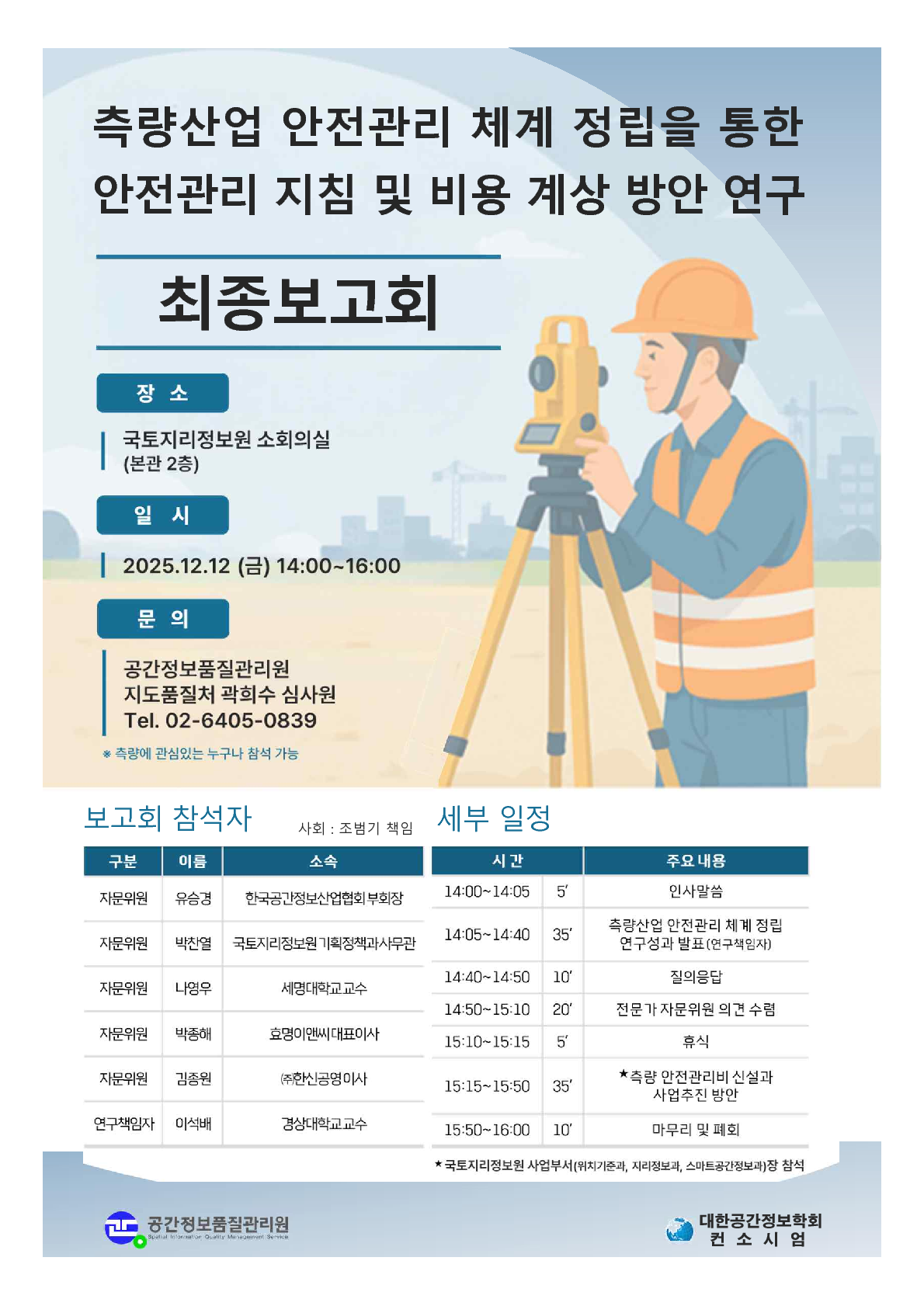 제목 측량산업 안전관리 체계 정립을 통한 안전관리 지침 및 비용 계상 방안 연구 최종보고회 작성자 작성일시 2025-12-11 10:17:30 조회수 184 첨부파일 측량산업안전 관련 최종보고회.pdf (173.42 KB) 목록