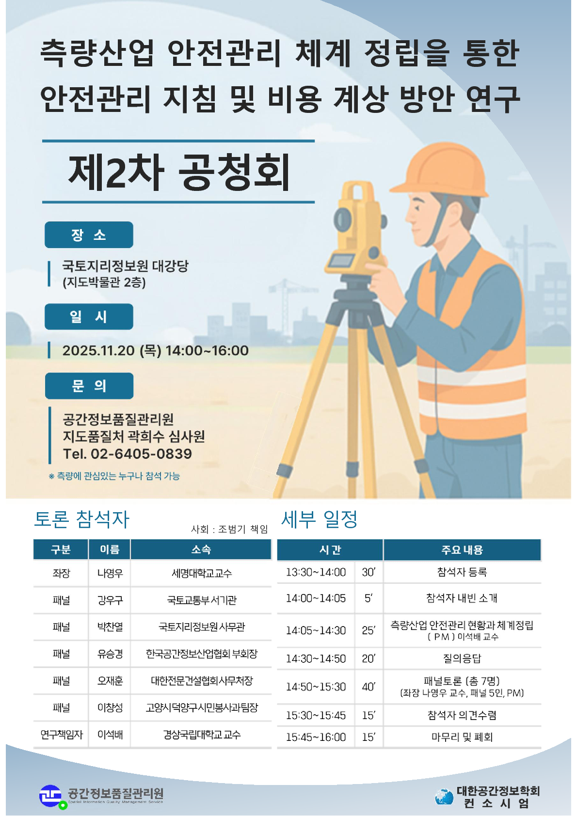 제목 측량산업 안전관리 체계 정립을 통한 안전관리 지침 및 비용 계상 방안 연구 작성자 작성일시 2025-11-20 09:19:59 조회수 44 첨부파일 측량산업안전 관련 공청회 포스터.pdf (278.2 KB) 목록